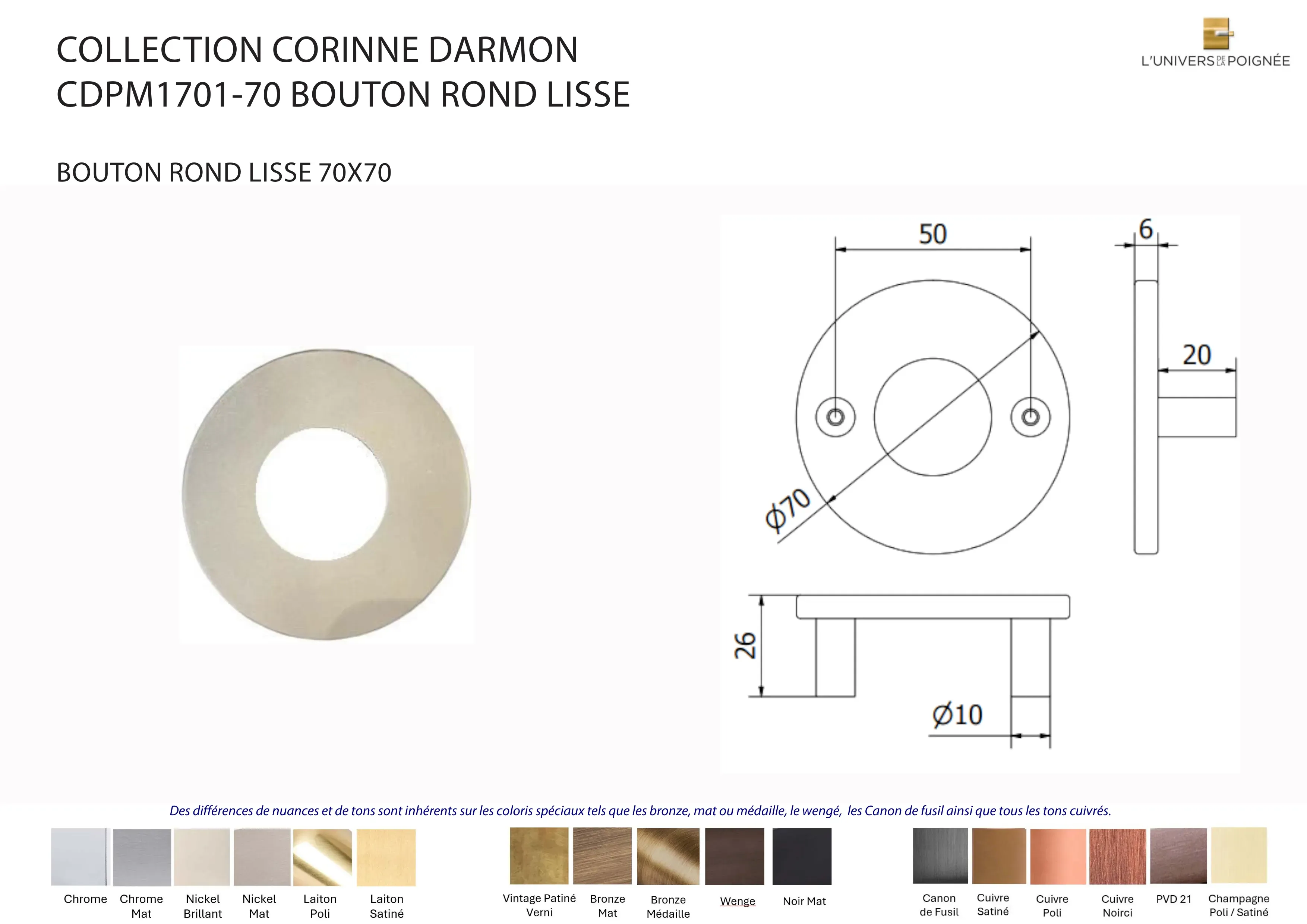 Laiton satiné ; Laiton poli ; Chrome mat ; Chrome brillant ; Nickel mat ; Nickel brillant ; Bronze mat ; Bronze médaille ; Bronze vintage ; Wengé ; Blanc ; Noir mat ; Canon de fusil ; Cuivre satiné ; Cuivre brillant ; Cuivre noirci ; Champagne mat ; Champagne brillant