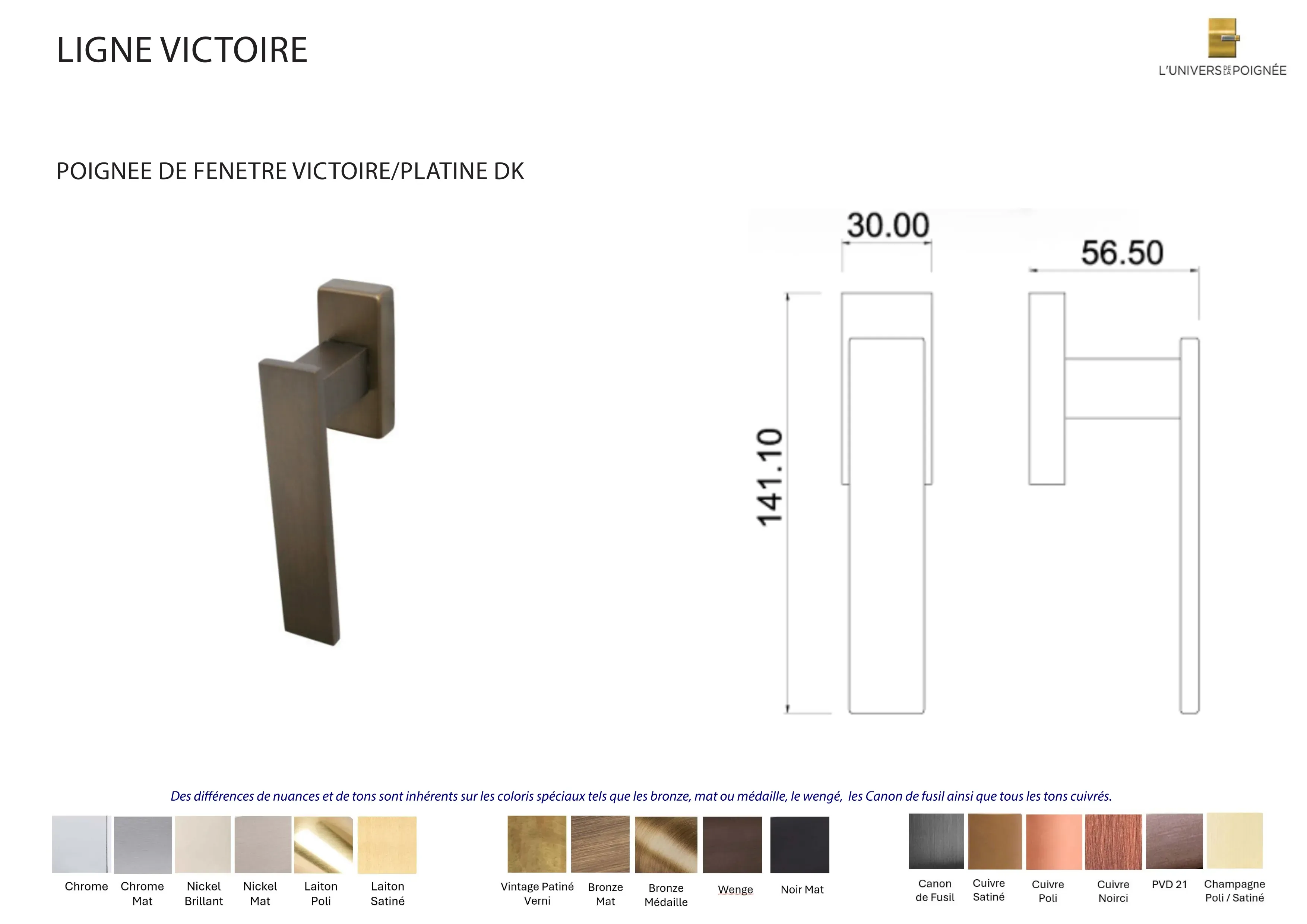 Parce que chaque intérieur mérite une finition sur mesure, la poignée de fenêtre Victoire est disponible en plus de 15 coloris différents, parmi lesquels : Laiton satiné ; Laiton poli ; Chrome mat ; Chrome brillant ; Nickel mat ; Nickel brillant ; Bronze mat ; Bronze médaille ; Bronze vintage ; Wengé ; Blanc ; Noir mat ; Canon de fusil ; Cuivre satiné ; Cuivre brillant ; Cuivre noirci ; Champagne mat ; Champagne brillant