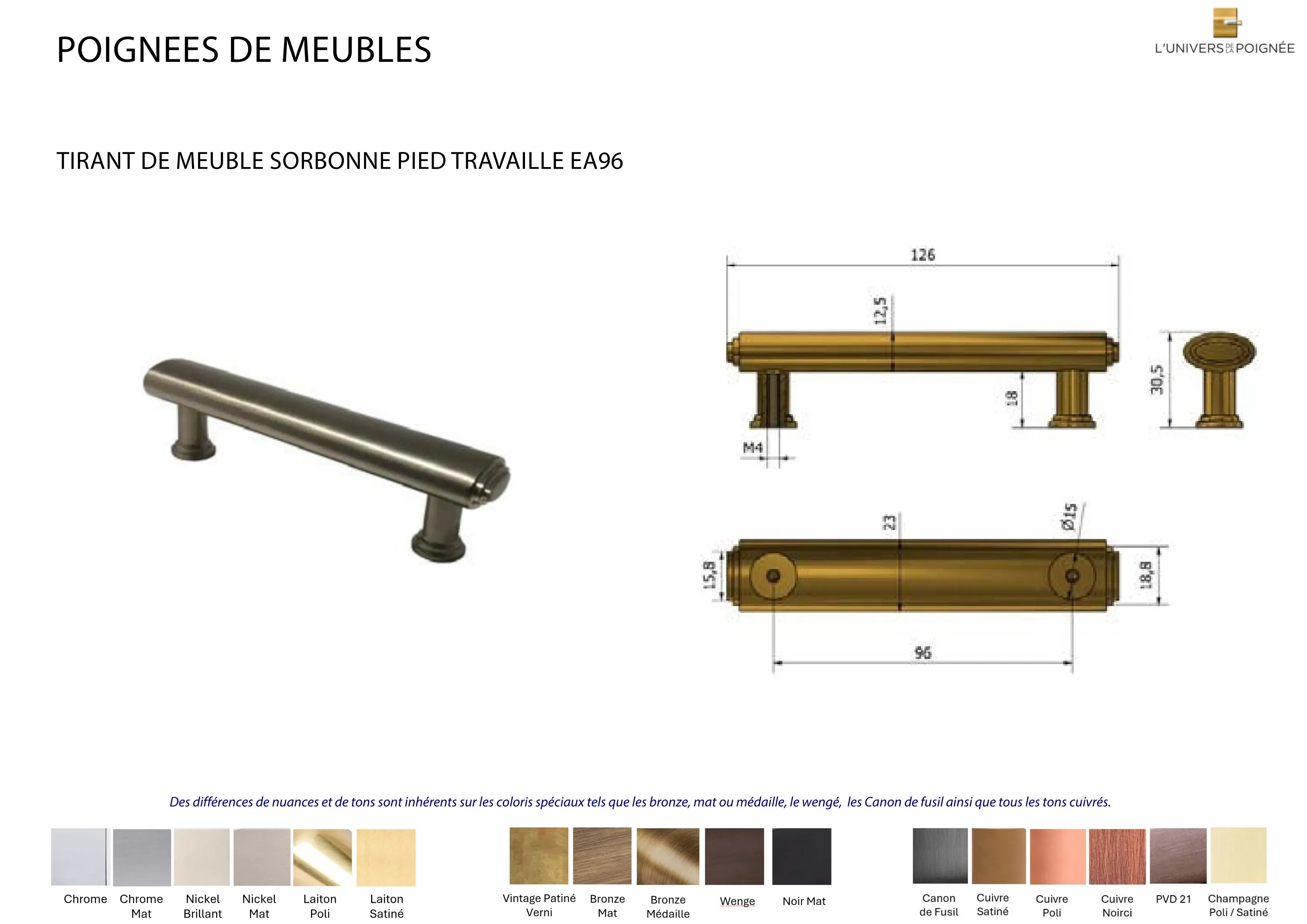 Parce que chaque intérieur mérite une finition sur mesure, le tirant est disponible en plus de 15 coloris différents, parmi lesquels : Laiton satiné ; Laiton poli ; Chrome mat ; Chrome brillant ; Nickel mat ; Nickel brillant ; Bronze mat ; Bronze médaille ; Bronze vintage ; Wengé ; Blanc ; Noir mat ; Canon de fusil ; Cuivre satiné ; Cuivre brillant ; Cuivre noirci ; Champagne mat ; Champagne brillant