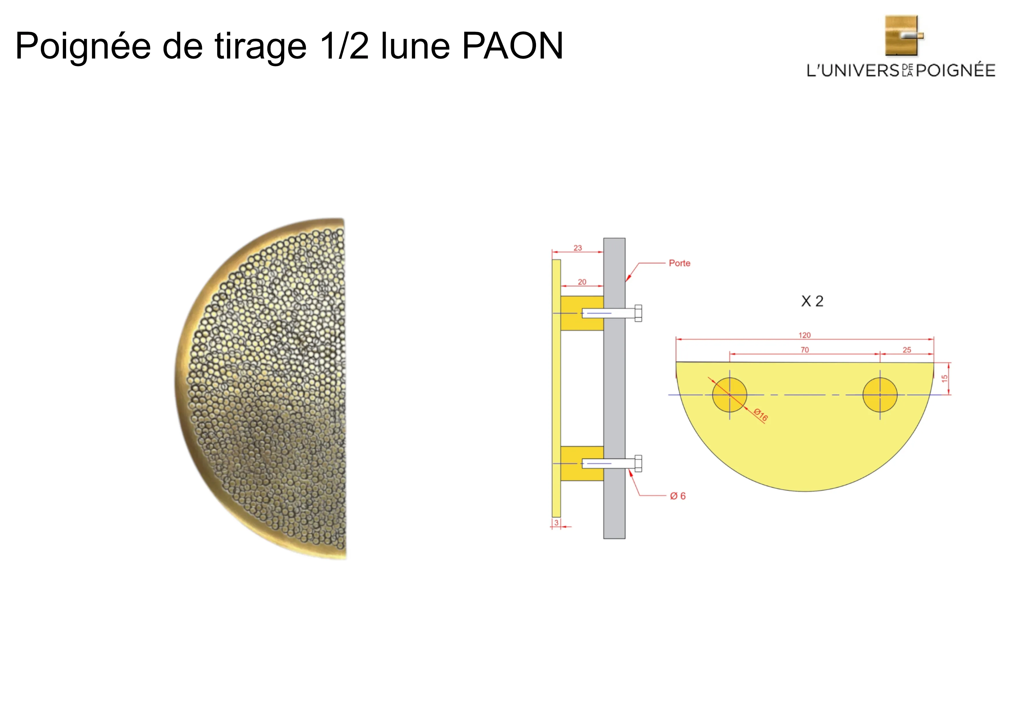 La plaque Demi-Lune Paon est une pièce élégante et décorative, conçue pour sublimer portes et meubles. Avec son diamètre de 120mm, elle présente un motif grainé qui rappellent la matière du Galuchat, apportant à chaque meuble une touche de sophistication.