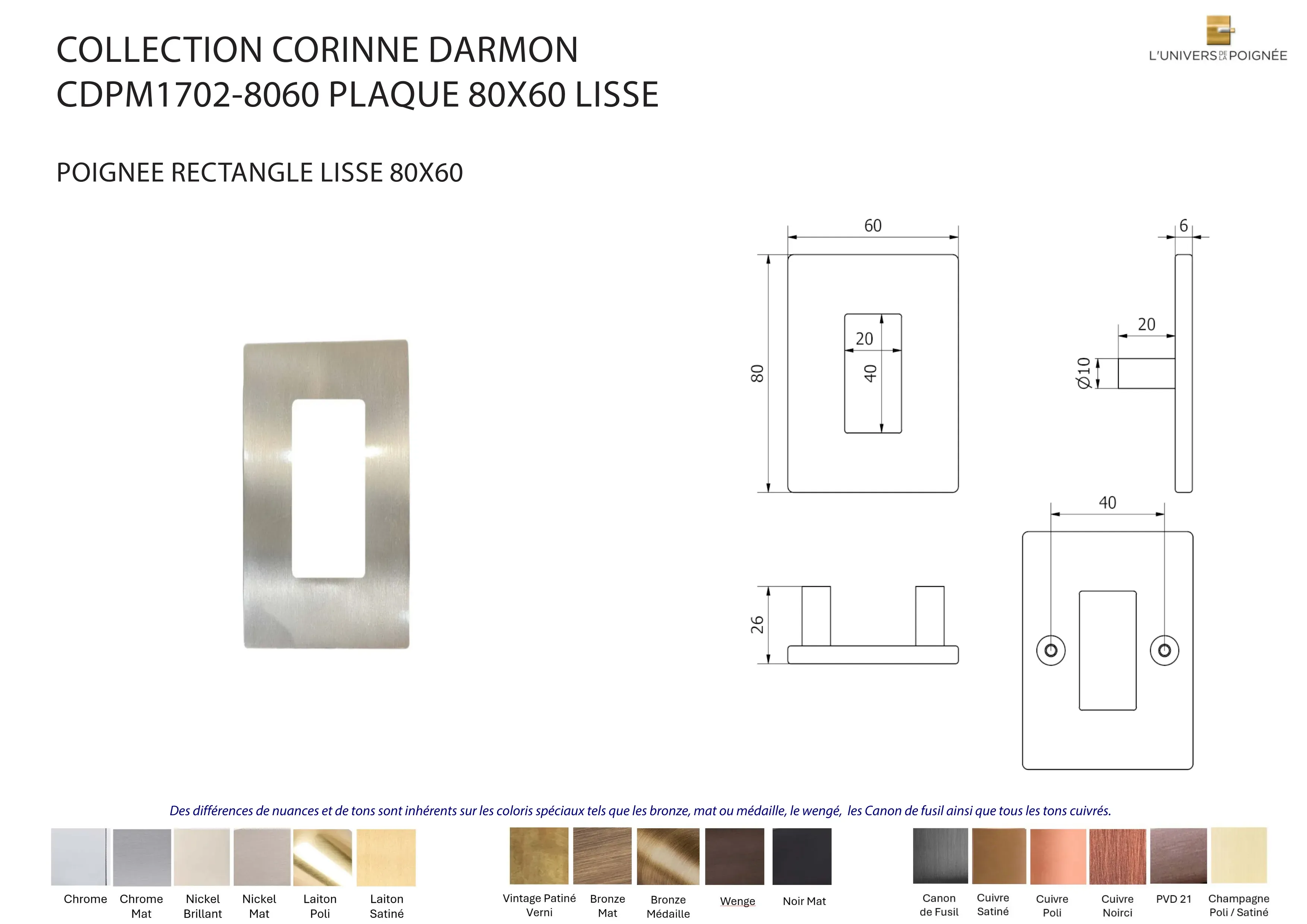 Laiton satiné ; Laiton poli ; Chrome mat ; Chrome brillant ; Nickel mat ; Nickel brillant ; Bronze mat ; Bronze médaille ; Bronze vintage ; Wengé ; Blanc ; Noir mat ; Canon de fusil ; Cuivre satiné ; Cuivre brillant ; Cuivre noirci ; Champagne mat ; Champagne brillant
