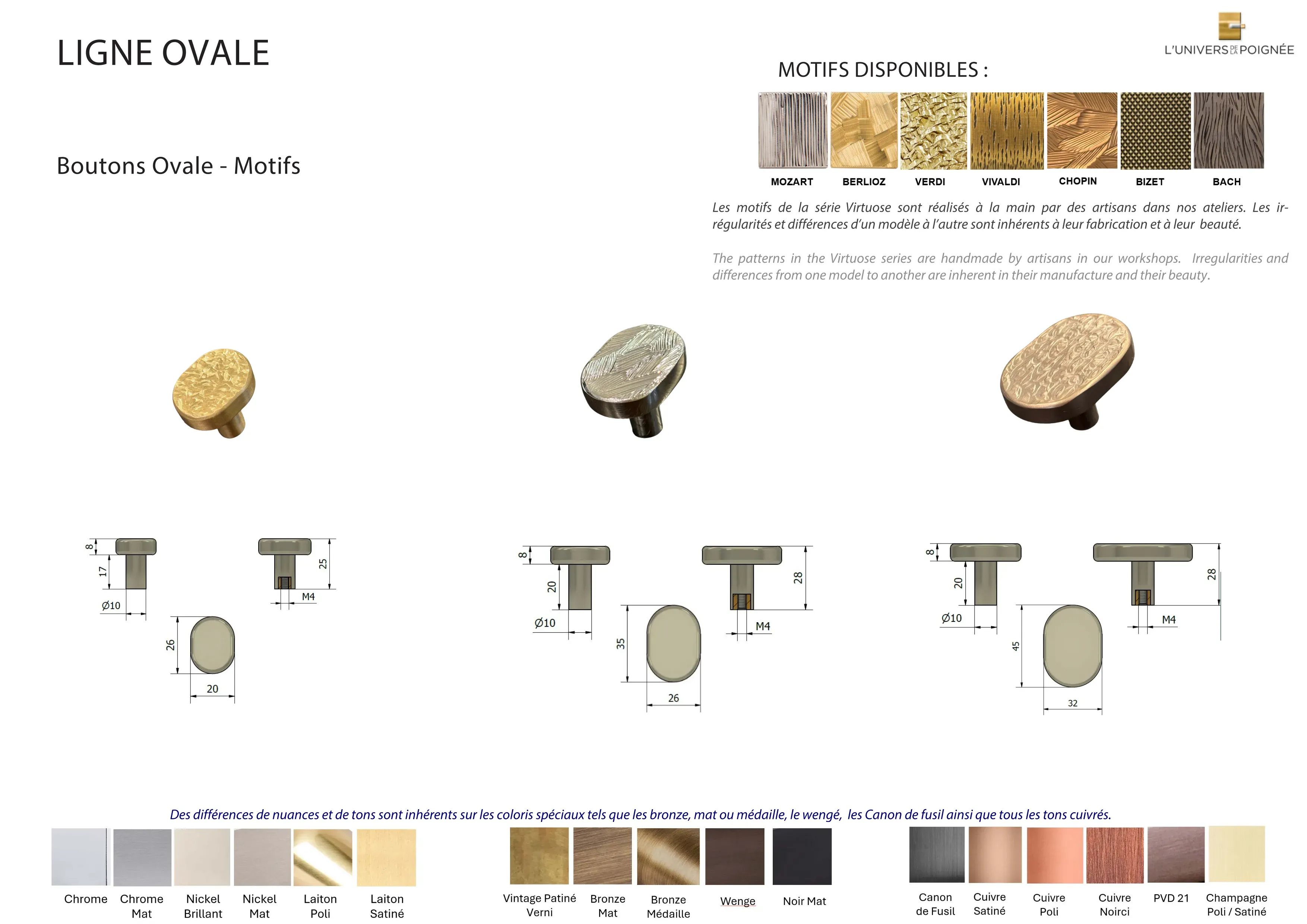 Parce que chaque intérieur mérite une finition sur mesure, le bouton Ovale est disponible en plus de 15 coloris différents, parmi lesquels : Laiton satiné ; Laiton poli ; Chrome mat ; Chrome brillant ; Nickel mat ; Nickel brillant ; Bronze mat ; Bronze médaille ; Bronze vintage ; Wengé ; Blanc ; Noir mat ; Canon de fusil ; Cuivre satiné ; Cuivre brillant ; Cuivre noirci ; Champagne mat ; Champagne brillant