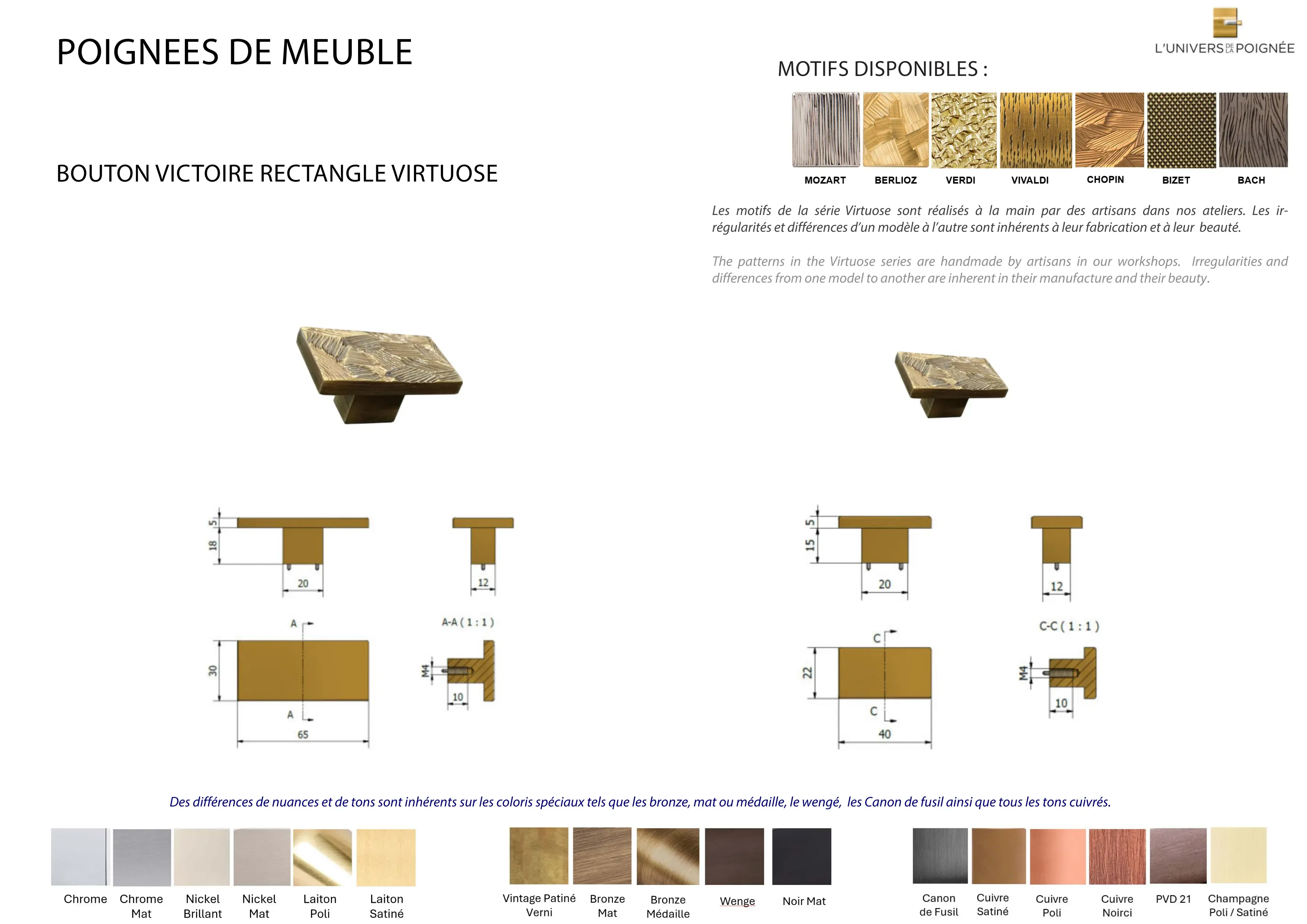 Parce que chaque intérieur mérite une finition sur mesure, le bouton de meuble Victoire rectangle est disponible en plus de 15 coloris différents, parmi lesquels : Laiton satiné ; Laiton poli ; Chrome mat ; Chrome brillant ; Nickel mat ; Nickel brillant ; Bronze mat ; Bronze médaille ; Bronze vintage ; Wengé ; Blanc ; Noir mat ; Canon de fusil ; Cuivre satiné ; Cuivre brillant ; Cuivre noirci ; Champagne mat ; Champagne brillant