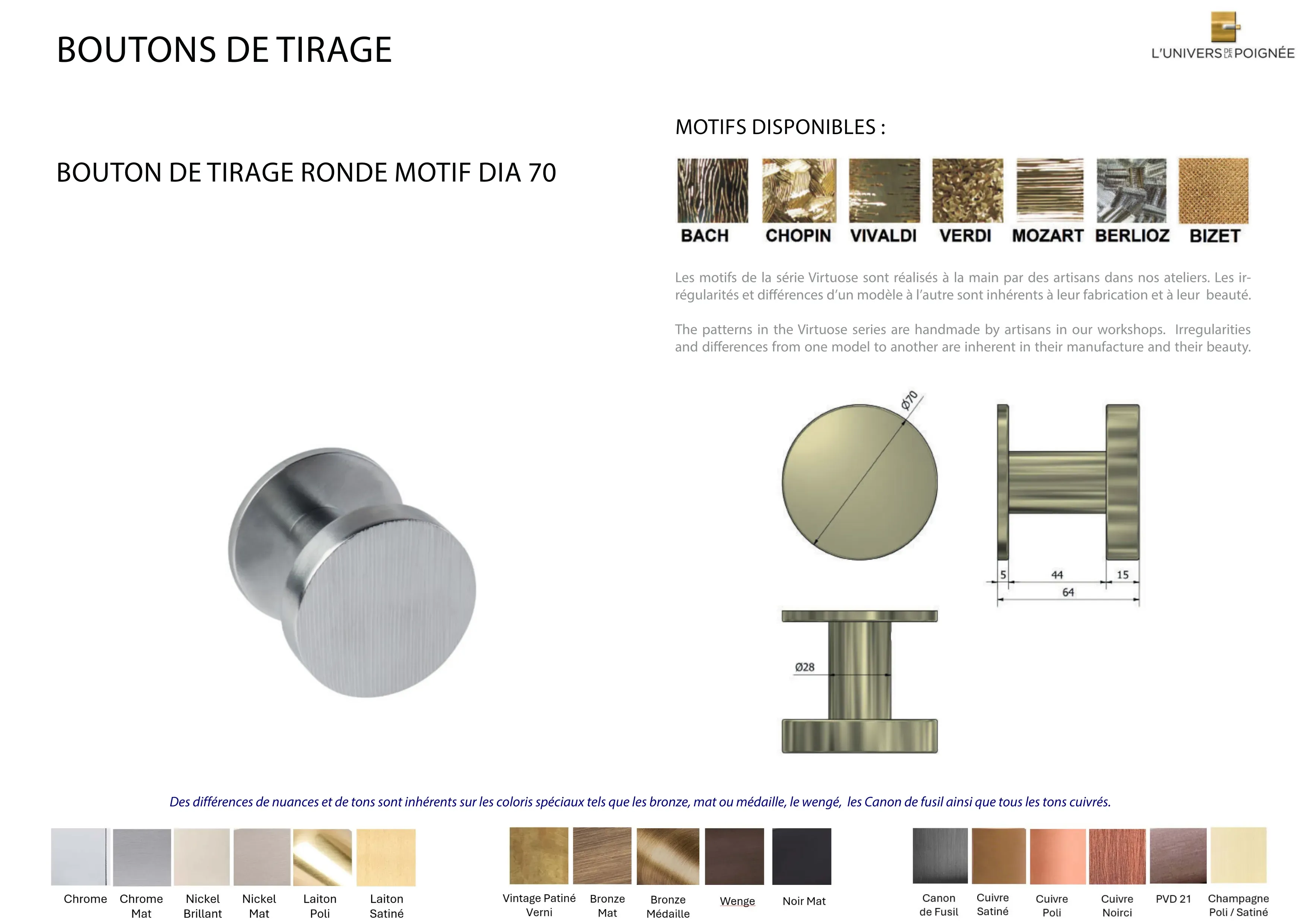 Bouton de tirage rond VIRTUOSE 70x70mm