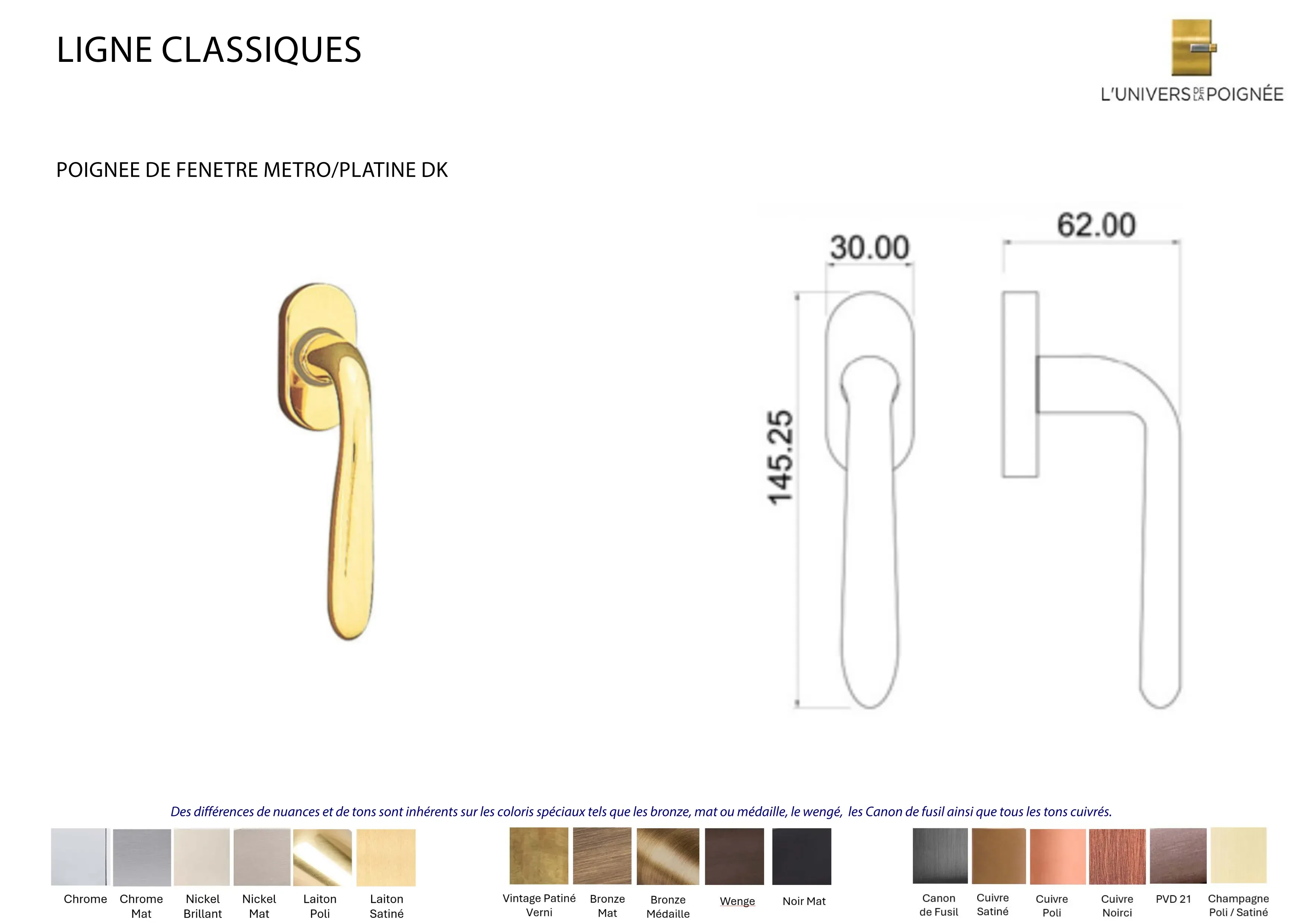 Parce que chaque intérieur mérite une finition sur mesure, la poignée de fenêtre Eole est disponible en plus de 15 coloris différents, parmi lesquels : Laiton satiné ; Laiton poli ; Chrome mat ; Chrome brillant ; Nickel mat ; Nickel brillant ; Bronze mat ; Bronze médaille ; Bronze vintage ; Wengé ; Blanc ; Noir mat ; Canon de fusil ; Cuivre satiné ; Cuivre brillant ; Cuivre noirci ; Champagne mat ; Champagne brillant