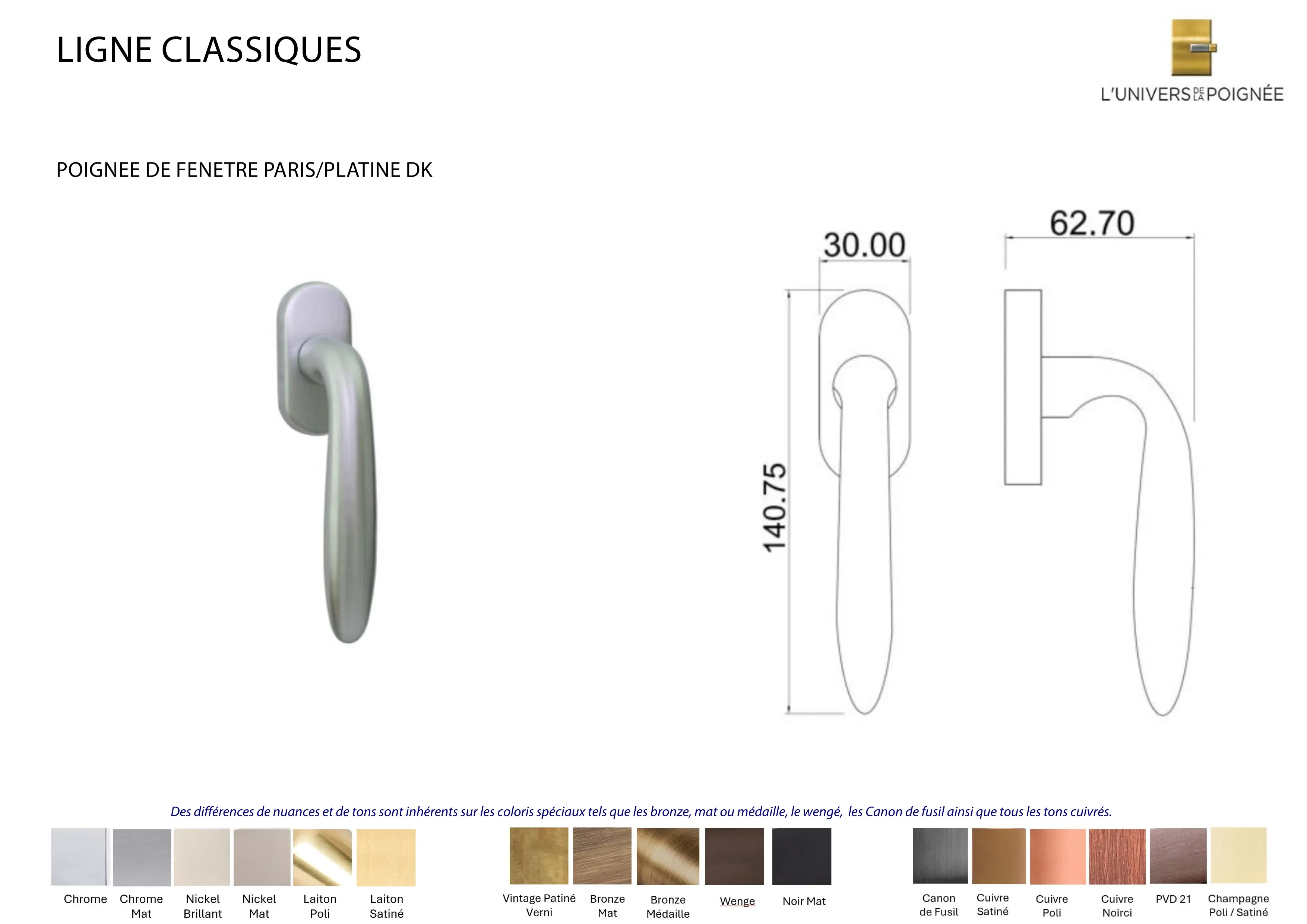 Des différences de nuances et de tons sont inhérents sur les coloris spéciaux tels que les bronze, mat ou médaille, le Wengé, les Canon de fusil ainsi que tous les tons cuivrés.