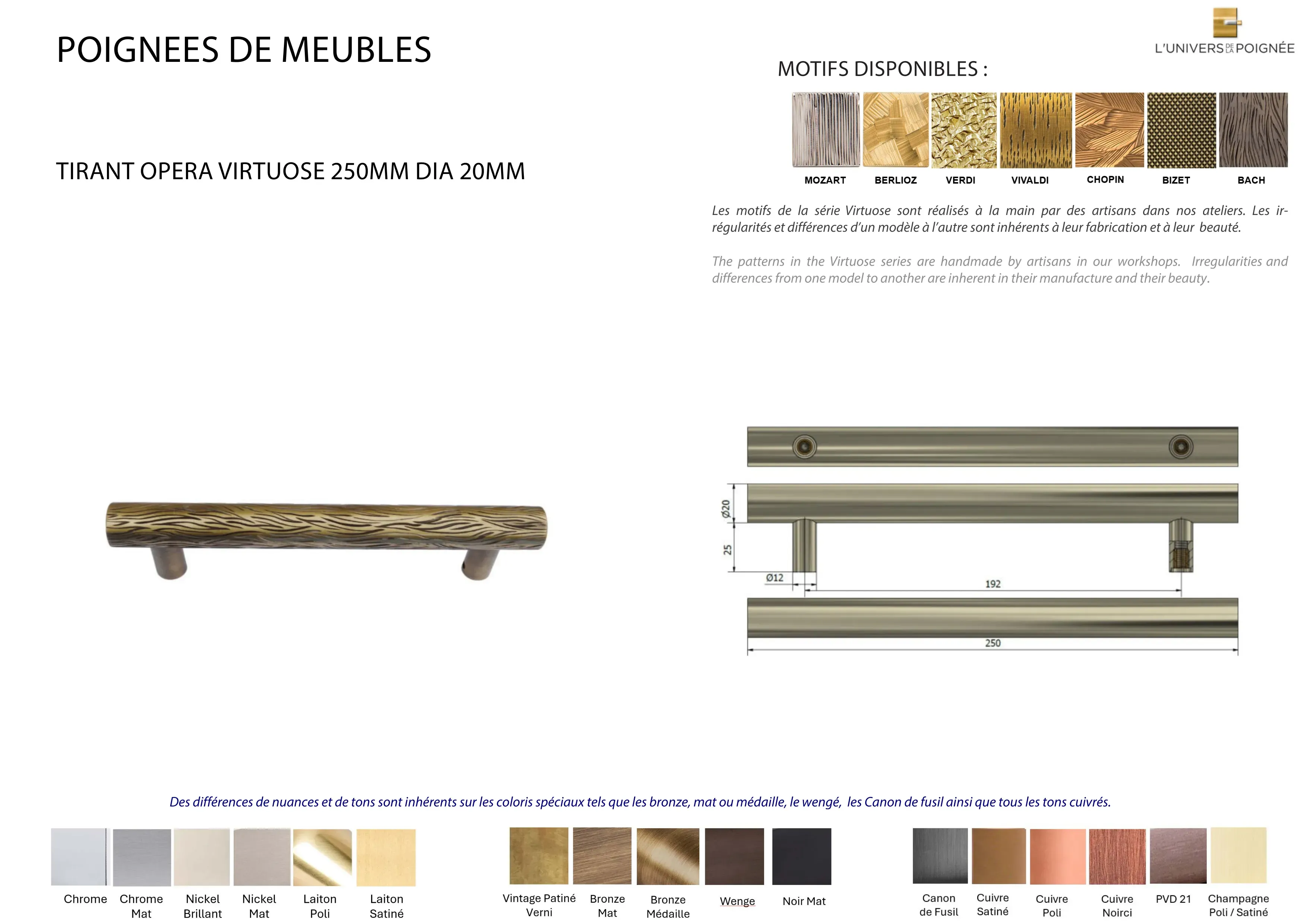 Parce que chaque intérieur mérite une finition sur mesure, le tirant est disponible en plus de 15 coloris différents, parmi lesquels : Laiton satiné ; Laiton poli ; Chrome mat ; Chrome brillant ; Nickel mat ; Nickel brillant ; Bronze mat ; Bronze médaille ; Bronze vintage ; Wengé ; Blanc ; Noir mat ; Canon de fusil ; Cuivre satiné ; Cuivre brillant ; Cuivre noirci ; Champagne mat ; Champagne brillant