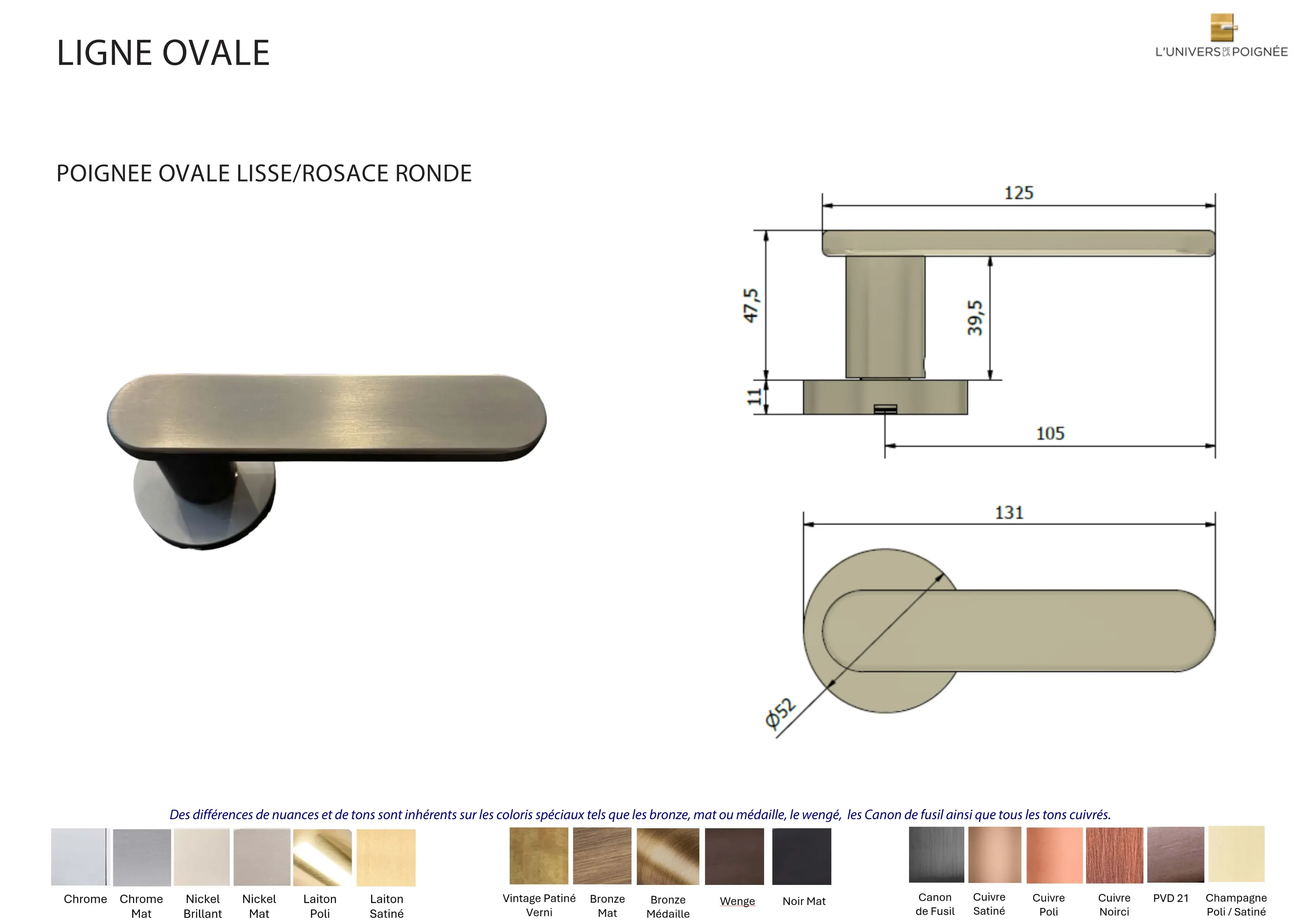 Parce que chaque intérieur mérite une finition sur mesure, la poignée de porte Ovale est disponible en plus de 15 coloris différents, parmi lesquels : Laiton satiné ; Laiton poli ; Chrome mat ; Chrome brillant ; Nickel mat ; Nickel brillant ; Bronze mat ; Bronze médaille ; Bronze vintage ; Wengé ; Blanc ; Noir mat ; Canon de fusil ; Cuivre satiné ; Cuivre brillant ; Cuivre noirci ; Champagne mat ; Champagne brillant