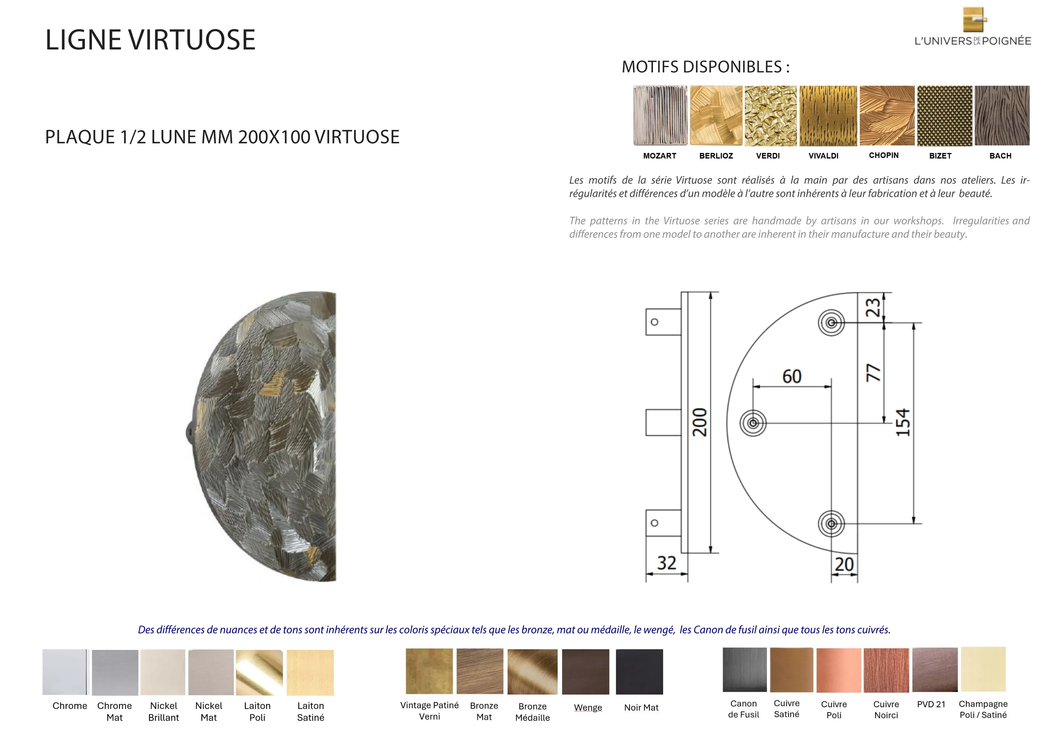 Parce que chaque intérieur mérite une finition sur mesure, cette plaque de tirage est disponible en plus de 15 coloris différents, parmi lesquels : Laiton satiné ; Laiton poli ; Chrome mat ; Chrome brillant ; Nickel mat ; Nickel brillant ; Bronze mat ; Bronze médaille ; Bronze vintage ; Wengé ; Blanc ; Noir mat ; Canon de fusil ; Cuivre satiné ; Cuivre brillant ; Cuivre noirci ; Champagne mat ; Champagne brillant