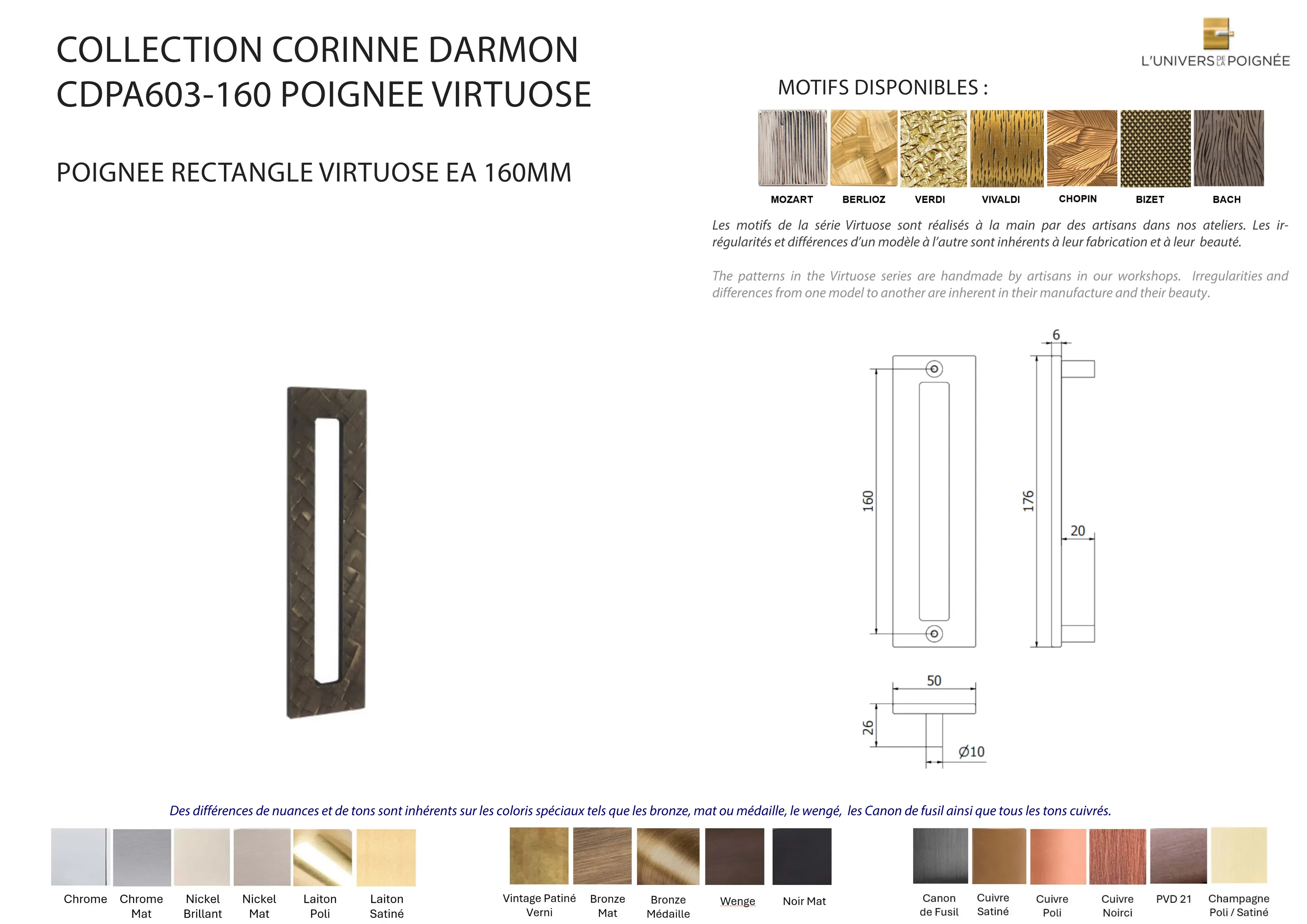 Laiton satiné ; Laiton poli ; Chrome mat ; Chrome brillant ; Nickel mat ; Nickel brillant ; Bronze mat ; Bronze médaille ; Bronze vintage ; Wengé ; Blanc ; Noir mat ; Canon de fusil ; Cuivre satiné ; Cuivre brillant ; Cuivre noirci ; Champagne mat ; Champagne brillant