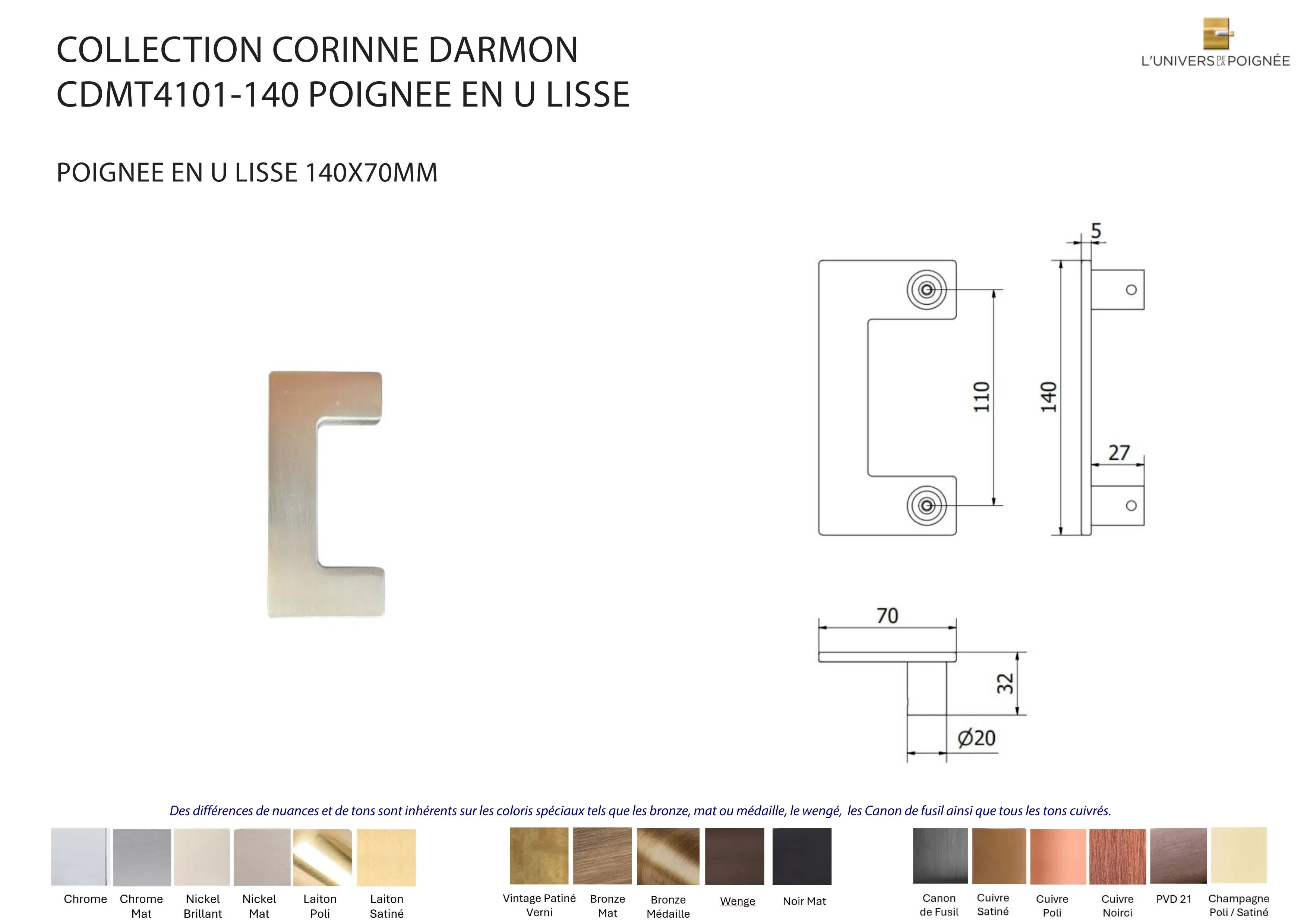 Laiton satiné ; Laiton poli ; Chrome mat ; Chrome brillant ; Nickel mat ; Nickel brillant ; Bronze mat ; Bronze médaille ; Bronze vintage ; Wengé ; Blanc ; Noir mat ; Canon de fusil ; Cuivre satiné ; Cuivre brillant ; Cuivre noirci ; Champagne mat ; Champagne brillant