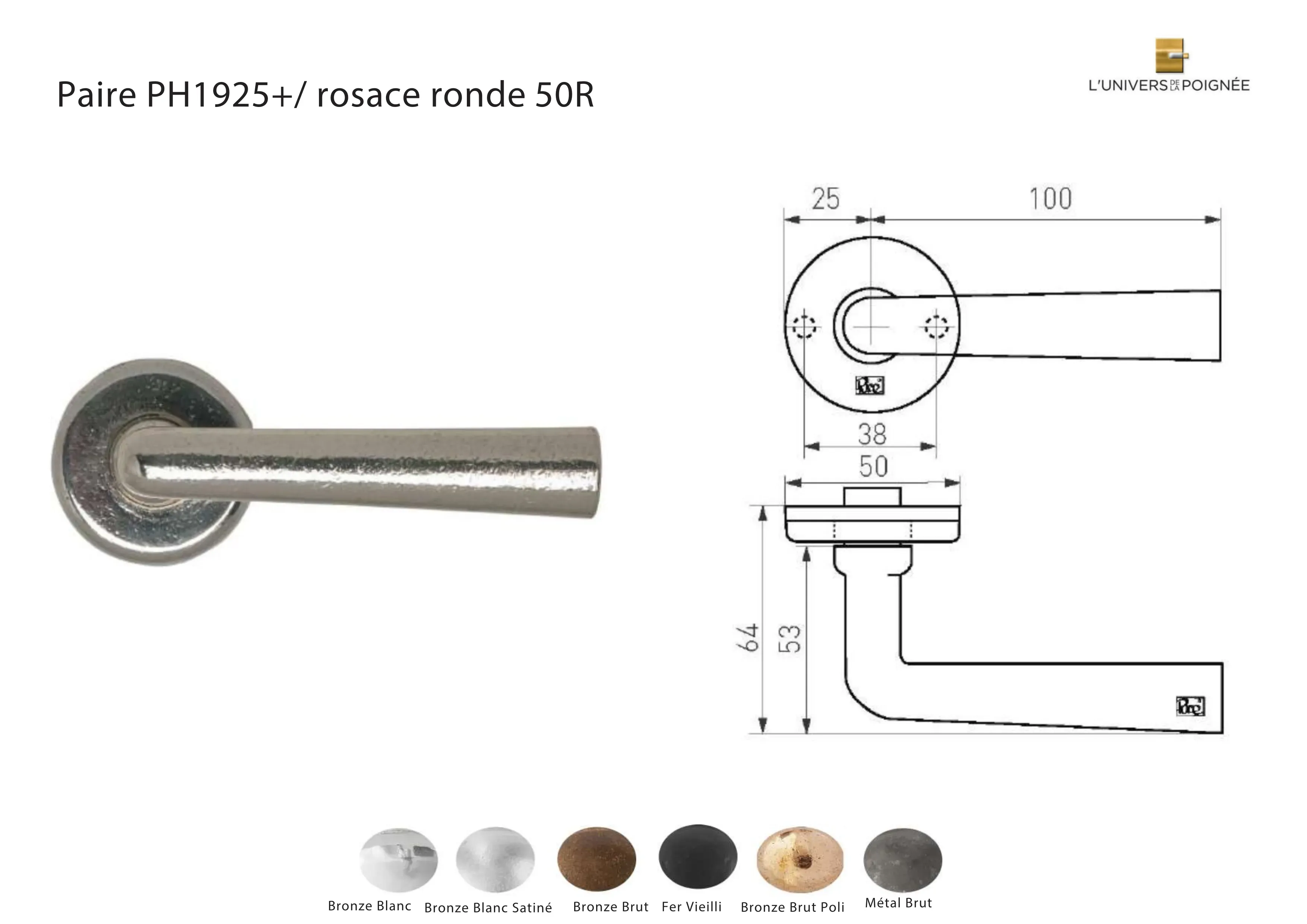 Disponible en 6 finitions possibles, cette collection s’adapte à divers styles et ambiances, offrant une touche de raffinement et de modernité à chaque pièce : Fer vieilli ; Métal brut ; Bronze blanc ; Bronze blanc satiné ; Bronze brut ; Bronze brut poli